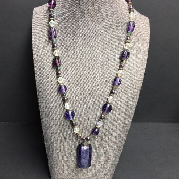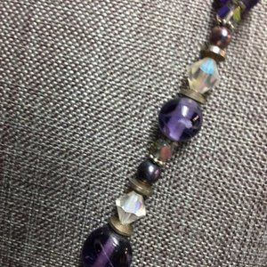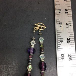 Beautiful purple iridescent rectangular purple pendant necklace with silvertone, purple, and clear faceted iridescent beads, toggle closure!