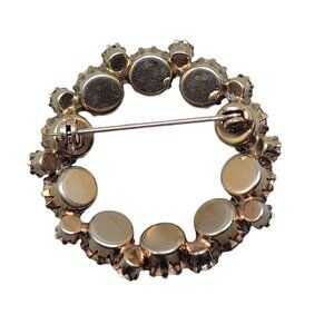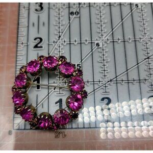 A stunning vintage brooch, adorned with brilliant purple and pink rhinestones, prong set on gold tone metal. Its large size makes a statement, perfect for those who love retro style.