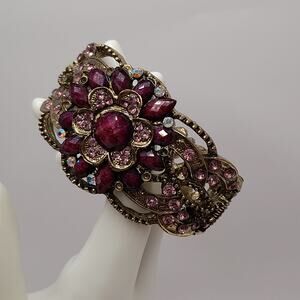 *Description: This is a hinged cuff bracelet featuring a floral design with purple and clear crystals set in a bronze-toned metal. The bracelet is positioned on a white, hand-shaped display. Hinged bracelets, also known as clamper bracelets, have a hinge mechanism that allows them to open and close, making them easier to put on and take off compared to traditional bangles. Cuff bracelets, which have been around for thousands of years, were worn in ancient civilizations like the Egyptians, Mayans, and Greeks. They have evolved over time and are still considered fashionable in contemporary jewelry trends. The depicted bracelet incorporates a vintage or Victorian-inspired design, possibly resembling styles from the Victorian era, which often featured intricate metalwork and gemstone settings. I counting 7 missing rhinestones while photographing. This would be a great addition to your jewelry collection or make a great gift!
