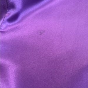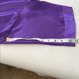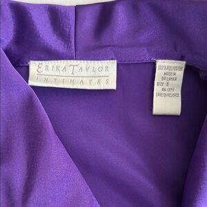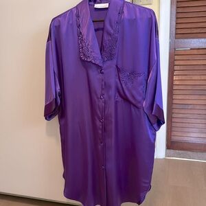 Elegant purple 100% polyester robe with button-up front. Features delicate embroidery on the collar and pocket.