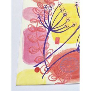 ‘Purple Queen’ is a vibrant acrylic marker painting by Artist Tristina Dietz Elmes. It features interesting color blocks with soft geometric shapes and energetic lines. There’s even the surprise of glitter used on the Queen Anne’s Lace and round leaf plant that gives this piece extra pop when seen in person!