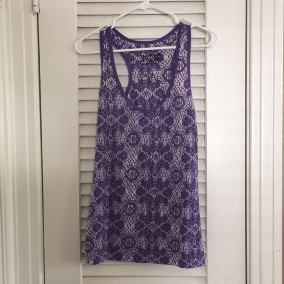 Purple and white patterned Racerback Tank. It’s sort of see through like a burnout material so it needs a Tank underneath! Brand is threads 4 thought from Saks. Let me know if you have any questions!