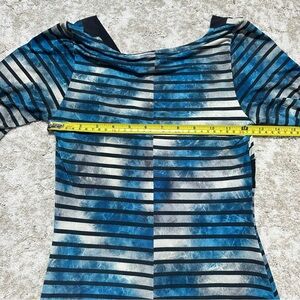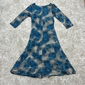 This elegant dress features a striking blue and black striped pattern, perfect for any occasion. The stylish design offers a flattering fit and a touch of sophistication.