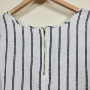 Stylish and fresh, this Purple Rain striped crop top features navy and white vertical stripes, a relaxed cropped fit, and short sleeves. Designed with a round neckline and exposed gold zipper on the back for a modern touch. Lightweight and breathable cotton-linen blend perfect for warm weather.