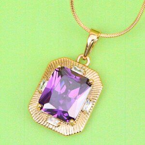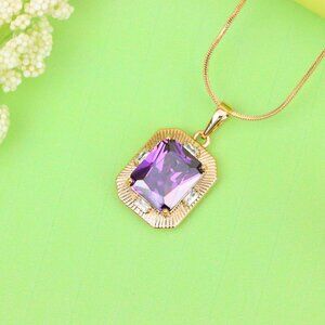 Elegant purple pendant framed in gold-plated brass with radiant detailing and baguette accents for a luxurious look.