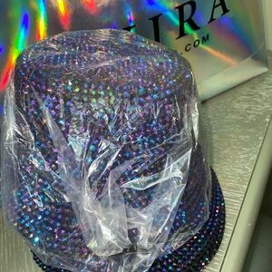 Stylish purple rhinestone bucket hat. Perfect for adding sparkle to any outfit! 💜