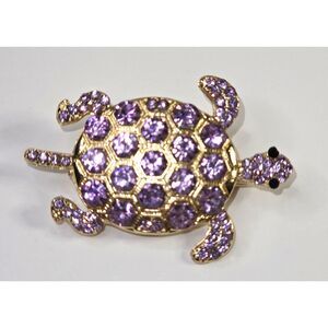 Turtle brooch has purple rhinestones gold tone setting, black rhinestone eyes. Measurements are approximate: See photo.