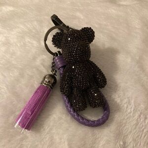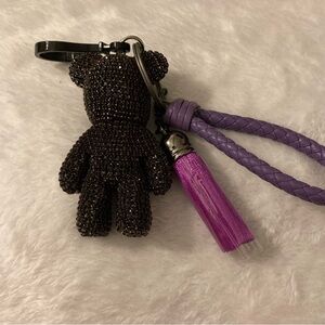 This teddy bear is made of sparkling rhinestones and comes with a tassel, leather wristlet, and hooks for both keys and/or bags.