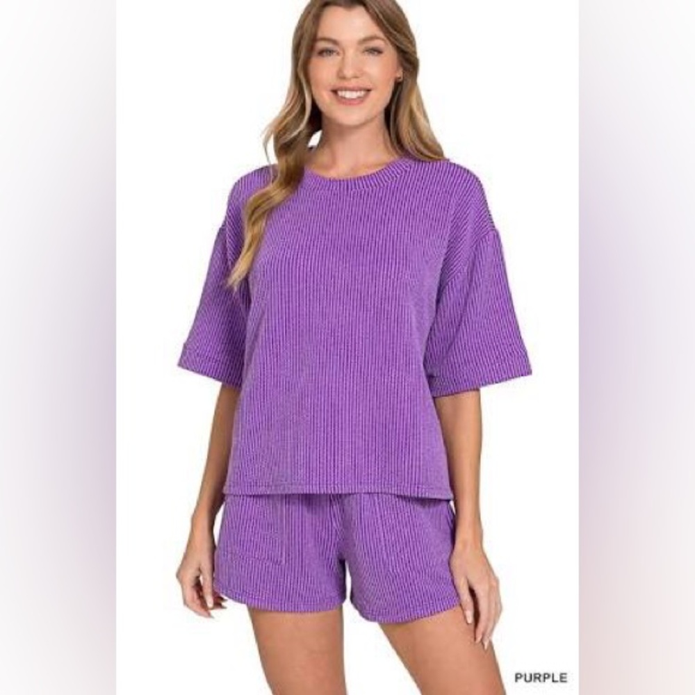 Stylish purple ribbed knit two-piece set. Includes a short-sleeve top and matching shorts. Perfect for casual wear.