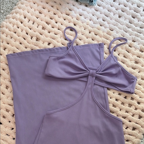Stylish purple ribbed two-piece set. Features a bow-tie top and matching skirt. Perfect for casual outings.