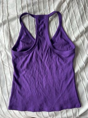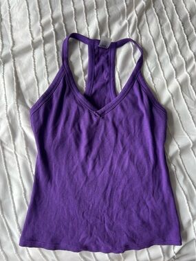 Vibrant purple ribbed tank with a V-neck and racerback. Stretchy, soft fabric. Great for layering or warm days.