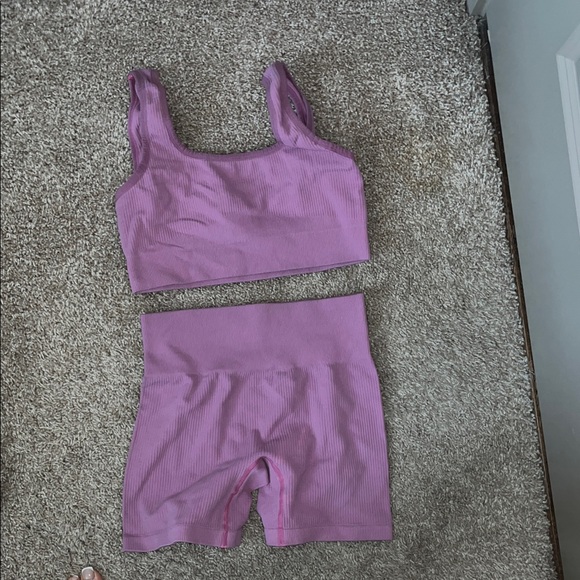 Stylish purple ribbed workout set. Includes a crop top and high-waisted shorts. Perfect for yoga or gym sessions.