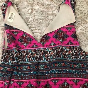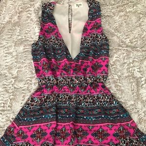 SMYM Riri Romper in print La Boheme from Revolve collab. Print is as bright IRL. Stretchy waist helps with putting on romper, and cinching waist while wearing. Cute with espadrilles and a belt over the waist. Button closure at the back of neck. Ruffles on bottom of leg. Smoke free home, cat friendly. Open to trades and offers, no lowballing please! Will discount if bundled.