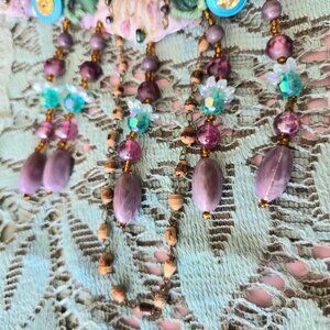 Step into a world of timeless romance with this breathtaking Victorian-style statement choker collar. A high-neck silhouette is adorned with hand-stitched and embroidered velvet roses in sumptuous shades of purple, lilac, and lavender. Delicate beadwork in cream, mint, and blue creates an ornate tapestry, while a dramatic beaded fringe adds showstopping movement. The meticulous bead embroidery and use of antique buttons make this piece a true work of art. Imagine it elevating a simple slip dress or adding a touch of whimsy to a gothic-inspired velvet gown. The pale pink satin lining ensures a comfortable fit, secured with a golden extension chain and clasp.