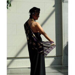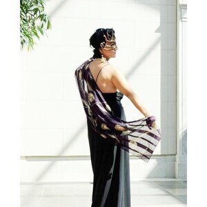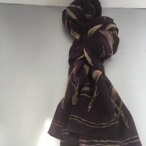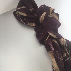 Lovely scarf on dark purple with gold roses with the stem and parts are outlined with a natural light green, tuxedo stripe texture on sheer thin fabric that feels like polyester