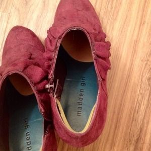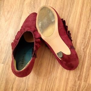 Suede with ruffle detail. Worn twice. Zipper closure on inside foot. Heel and ball inserts (see pics) already in for added fit and comfort. Size 5.5.