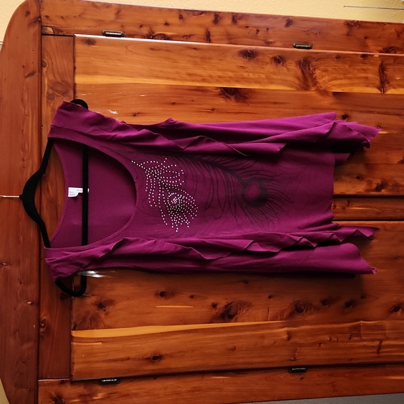 Purple ruffle shirt with feather rhinestone design.