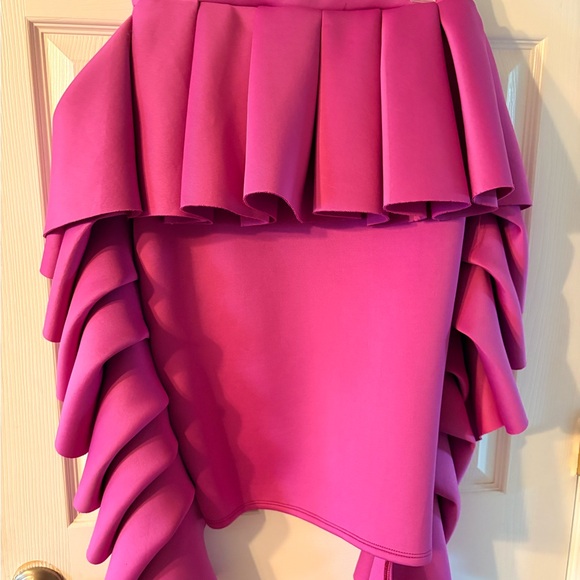 Step out in style with this elegant pink ruffled skirt. Perfect for any occasion, this skirt adds a touch of sophistication to your wardrobe.