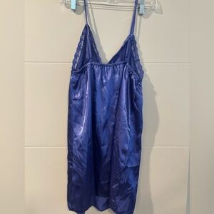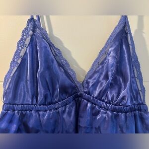 This purple chemise is crafted from a satin-like fabric, offering a smooth and silky feel with a subtle sheen. It features a V-neckline and thin spaghetti straps, complemented by an empire waist with delicate gathering under the bust. The classic design and vibrant color make it a standout piece in intimate sleepwear.
