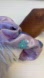 Stylish purple scrunchie adorned with blue and gold sequins. Perfect for adding a touch of sparkle to your hairstyle.