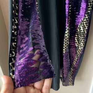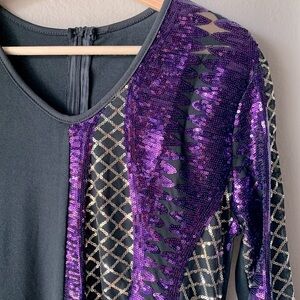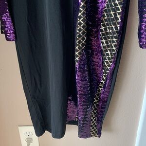 Description: Purple Sequin Long Sleeve Midi Dress. Sheer between sequins from top to bottom and in the sleeves. See photo.