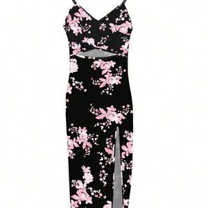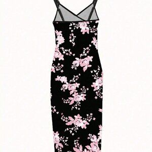 Purple Sexy Women's Printed Asymmetrical Hem Split Spaghetti Strap Bodycon Dress