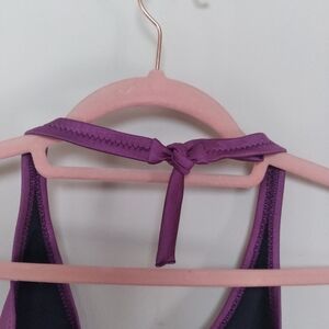 unbranded purple shimmery metallic halter style string bikini top that ties at neck and back