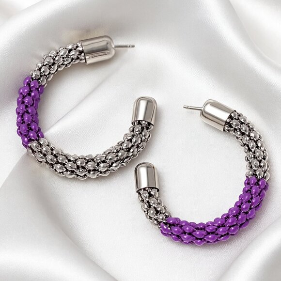 Purple & Silver Braided Beaded Hoop Earrings –Bold Statement Fashion Jewelry