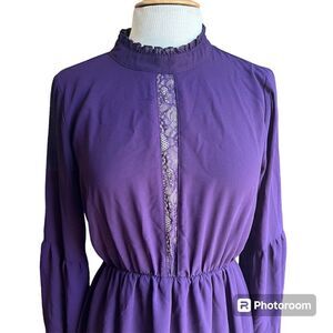 Purple Small Mock Neck Long Sleeve Tiered Keyhole Closure Lace Detail Mini Dress