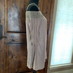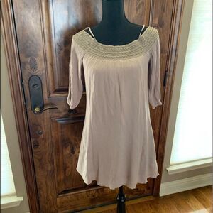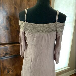Tan/Khaki color mini dress on/off shoulders lightweight adjustable straps elastic neckline 3/4 cuffs color may vary due to lighting thread loose on neckline please see all pictures) fully lined crinkle fabric great preloved condition smoke/pet free