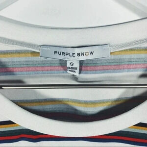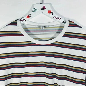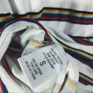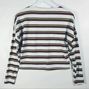 Super soft white long-sleeve top with black, yellow, grey, green, red, and blue stripes.