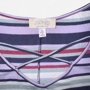 Purple striped mini t-shirt dress with v-neck cross detailing at the neck, and short sleeves. Juniors XL. Great used condition.