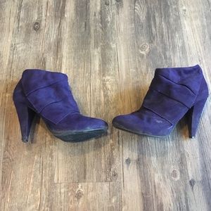 Add color and texture to your wardrobe with these purple suede booties. They're so much fun! Wear them for a night out or casually. They're gently worn down at the bottoms and it's back soles are coming out a little bit - easy to replace and still good condition! Too cute to just be sitting in my closet unused. Sz 8! 3 1/2-4 in heel - see photo for measurement!