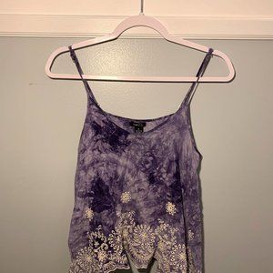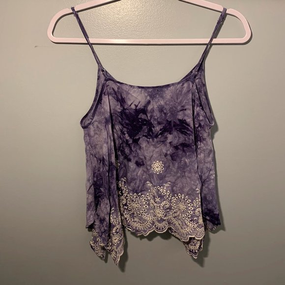 Purple tie-dye tank with embroidery accents along bottom hem.