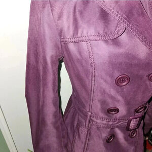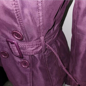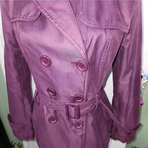 This jacket is gorgeous! A pretty purple! I consider a trench coat style. Perfect for fall or spring! Excellent pre-owned condition! SF/PF