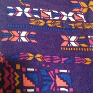 Purple with Tribal Print; has a little tie thing in the front on the bottom. Very cute!
