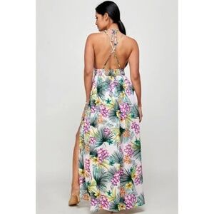 Purple Tropical Floral Palm Vacation Cruise Summer Sexy Slit Maxi Halter Dress
