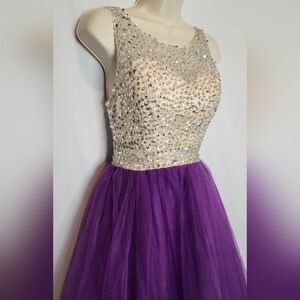 Elegant purple tulle gown featuring a sparkling beaded bodice. Worn once for a photoshoot. Adjustable size.