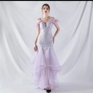 Purple, V Neck, Abstract Print, Ostrich Feathers, Tulle, Mermaid Gown