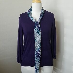 Purple V-Neck Stretch Sweater. No tag or fabric content info. Bust is 22 inches across. Scarf is attached.