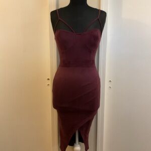 This Purple Faux Suede Bodycon Dress by Privy features a solid design with a sleeveless, V-neck style and a knee-length hem. The dress is crafted from a combination of polyester and suede material, offering a luxurious feel. It has a zip closure and showcases strappy sleeves, perfect for a party or cocktail event. The sleek bodycon silhouette and rich purple color make it a versatile piece suitable for various seasons like winter, summer, fall, and spring.