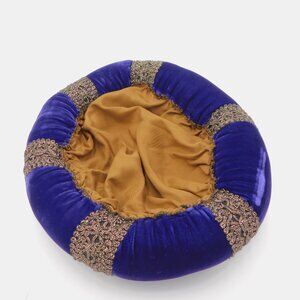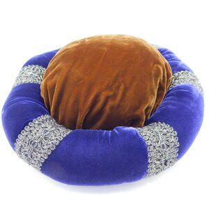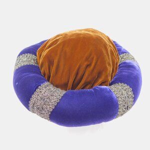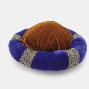 Royal purple velvet circle hat with gold ribbon details and golden brown velvet top. Great for a Halloween costume, RenFests, Renaissance Festivals, and/or medieval cosplay. Approximately 10.5" diameter across the entire hat, 7" diameter where the head would fit, 5" high. Flaw: on the bottom, there is a dent in the velvet. In very good used condition.