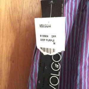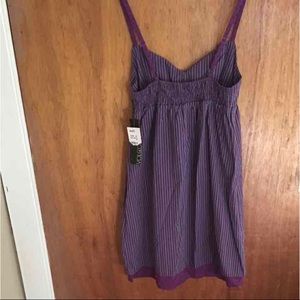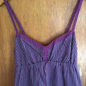 Purple and blue stripe with purple polka dot detailing at the bottom and on the bodice of dress.