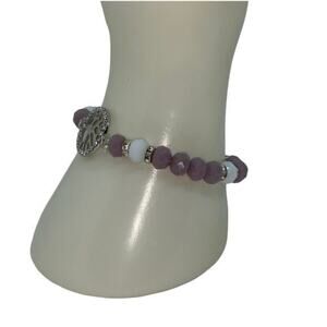 NWT Purple & White Beaded Silver-Tone Tree of Life Pendant Rhinestone Stretch Bracelet