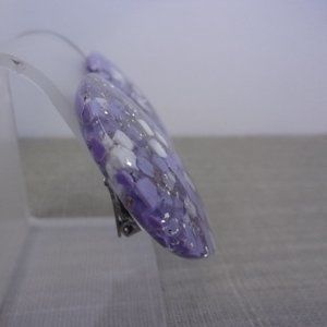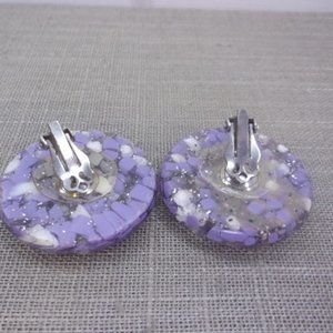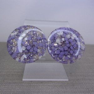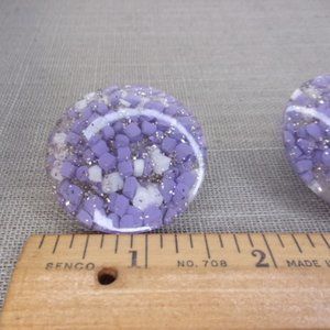 Purple and white with silver glitter confetti lucite clip earrings, unknown maker, nice condition, pretty vintage earrings.