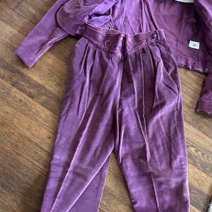 Elegant purple suit jacket and high waisted set for women. Features intricate detailing on the jacket.