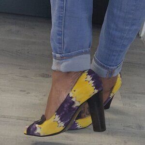 Info: A unique triangle heel that will be the center of attention. Purple, yellow and white colorway fabric that feels like . Please review all photos for wear.