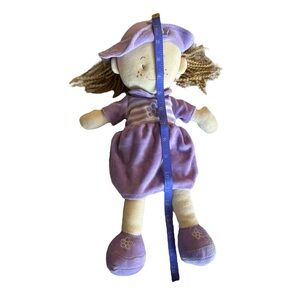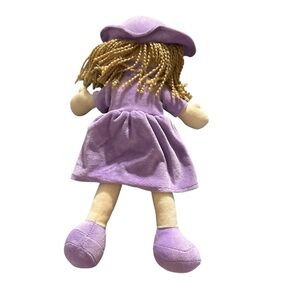 This charming stuffed animal features a soft, plush body in a delightful purple and cream color scheme. Its yarn-like hair is styled in playful pigtails, and it wears a matching purple hat that adds a touch of whimsy. Perfect for cuddling and imaginative play, this toy is a wonderful addition to any collection.