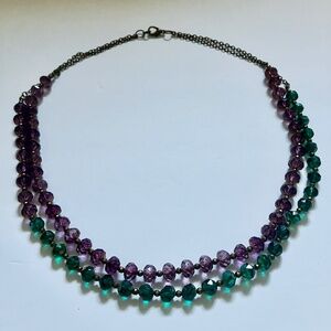 Sparkly double strand purple and green jewel tones Czech glass faceted necklace with brass accents. Elegant and versatile.