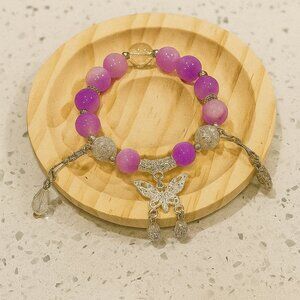 Elegant bracelet featuring purple and pink beads with silver butterfly and leaf charms. Perfect for adding a touch of color and charm to any outfit.